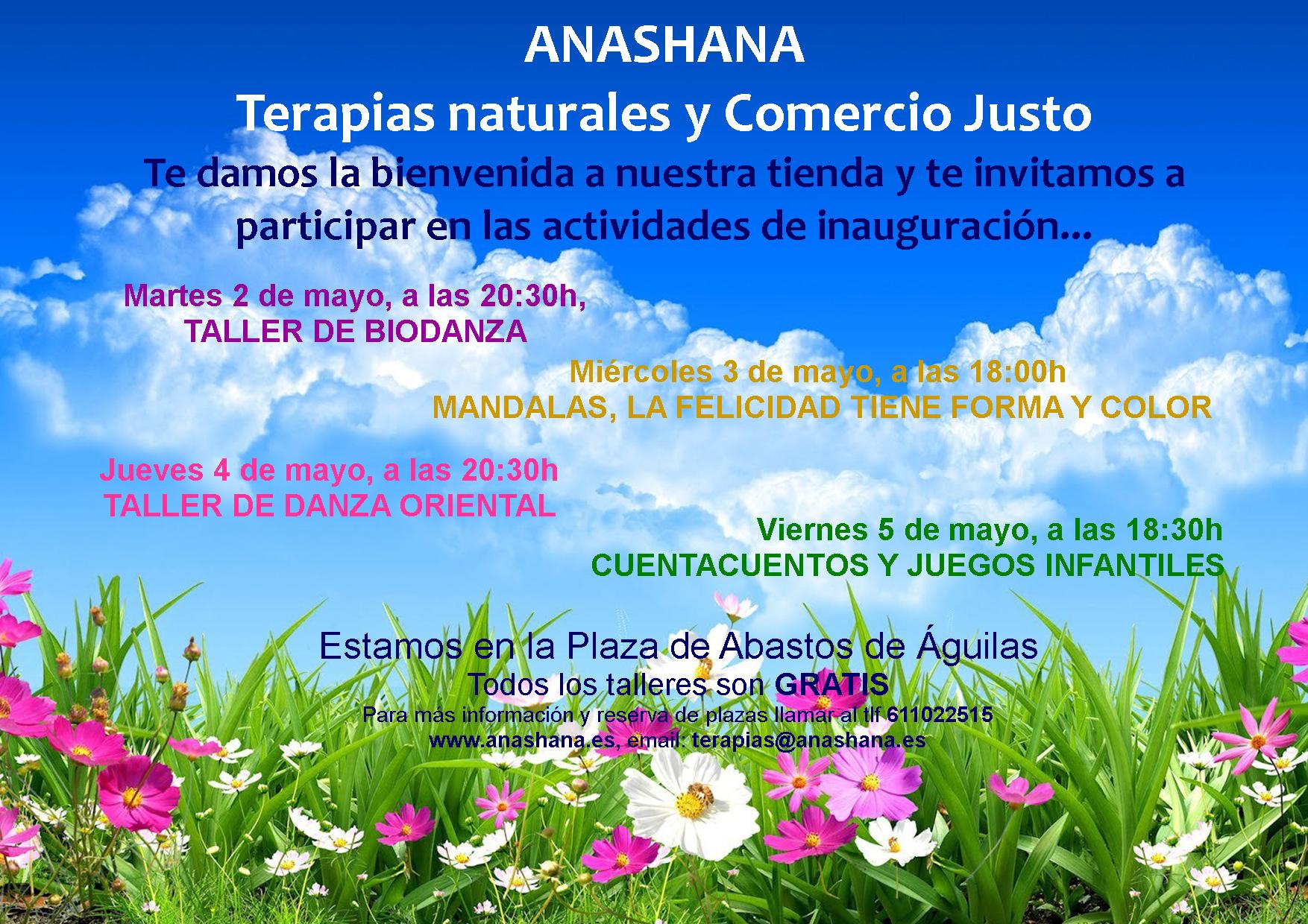 Talleres gratuitos del 2 al 5 mayo para celebrar la puesta en marcha de nuestra tienda de Comercio Justo, artesanía local y productos naturales en la que podrás encontrar además, artículos de gemoterapia, meditación, aromaterapia, sal del himalaya, bisuteria y complementos, decoración y muchas cosas más...