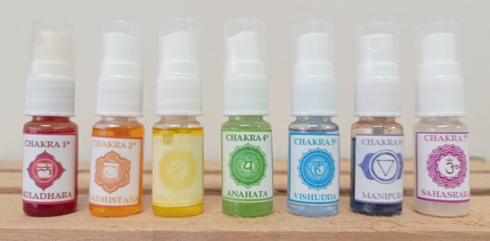 El conjunto se compone de 7 vaporizadores de 10ml; cada esencia contiene extracto de piedras naturales (amatista, cuarzo rosa, cristal de cuarzo, ojo de tigre, etc, a cada chakra le corresponden unas piedras concretas); aceites esenciales puros (rosas, lavanda, laurel, etc, dependiendo del chakra) y el color). Precio 21€