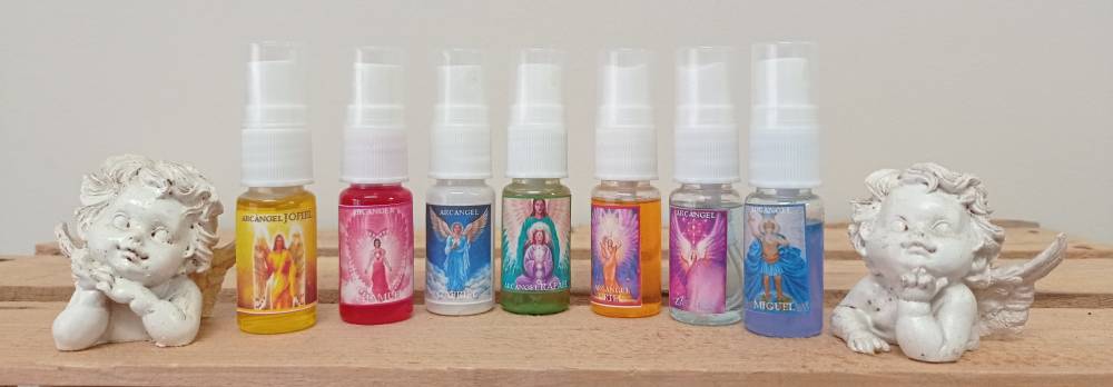 Este tipo de esencias, también se conocen como esencias áuricas porque actúan directamente en el campo electromagnético del cuerpo (aura). Se presentan en forma de vaporizador para rociar alrededor del cuerpo y, de este modo, barrer y expulsar toda carga o residuo energético que no vibre con la perfecta armonía. O bien, para atraer a nuestra vida aquello que anhelamos por el principio de Ley de Atracción. Están hechas con los aceites esenciales propios de cada arcángel, así como su color y piedra natural , para ayudarnos a desarrollar en nosotros su potencial y atraer a nuestra vida su energía. El conjunto está compuesto por siete vaporizadores de 10ml, uno por cada arcángel, junto con las instrucciones de uso, descripción y oración de cada uno de ellos. El precio es de 21€, también se venden por separado.