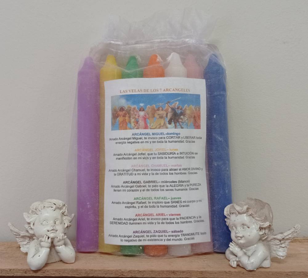 Conjunto de velas de los 7 Arcángeles, cada vela y cada color le corresponde a un día de la semana y a un arcángel determinado. La forma de usar el luminario, es ir encendiendo cada día una vela y recitar la oración correspondiente. Siempre se empieza el domingo, con la vela azul de San Miguel Arcángel, recitaremos su oración para atraer a nuestra vida PROTECCIÓN, FORTALEZA Y CONFIANZA, y así continuaremos el resto de los días hasta completar la semana. El conjunto se presenta en una bolsa de organza, junto con la descripción y oración de cada uno de los arcángeles. Precio 7€